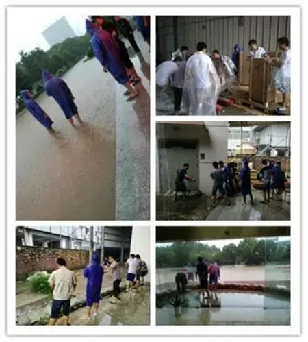 7月5日晚,暴雨如期而至。因此前已制訂詳細預案,從防汛物資到人員動員各方面做了充分準備,所有重要物料均已在暴雨來臨前轉(zhuǎn)移至高處,公司大樓和設備廠房前也已壘起層層沙袋。7月6日清晨6點,公司總經(jīng)理鄧家科冒著暴雨涉水來到公司,帶領數(shù)十名員工現(xiàn)場組織防汛抗洪。